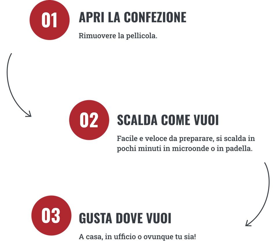 Piatti pronti della tradizione toscana, confezionati in pratiche vaschette monoporzione adatte al microonde, con pellicola easy peel, facile da aprire e comoda da utilizzare.