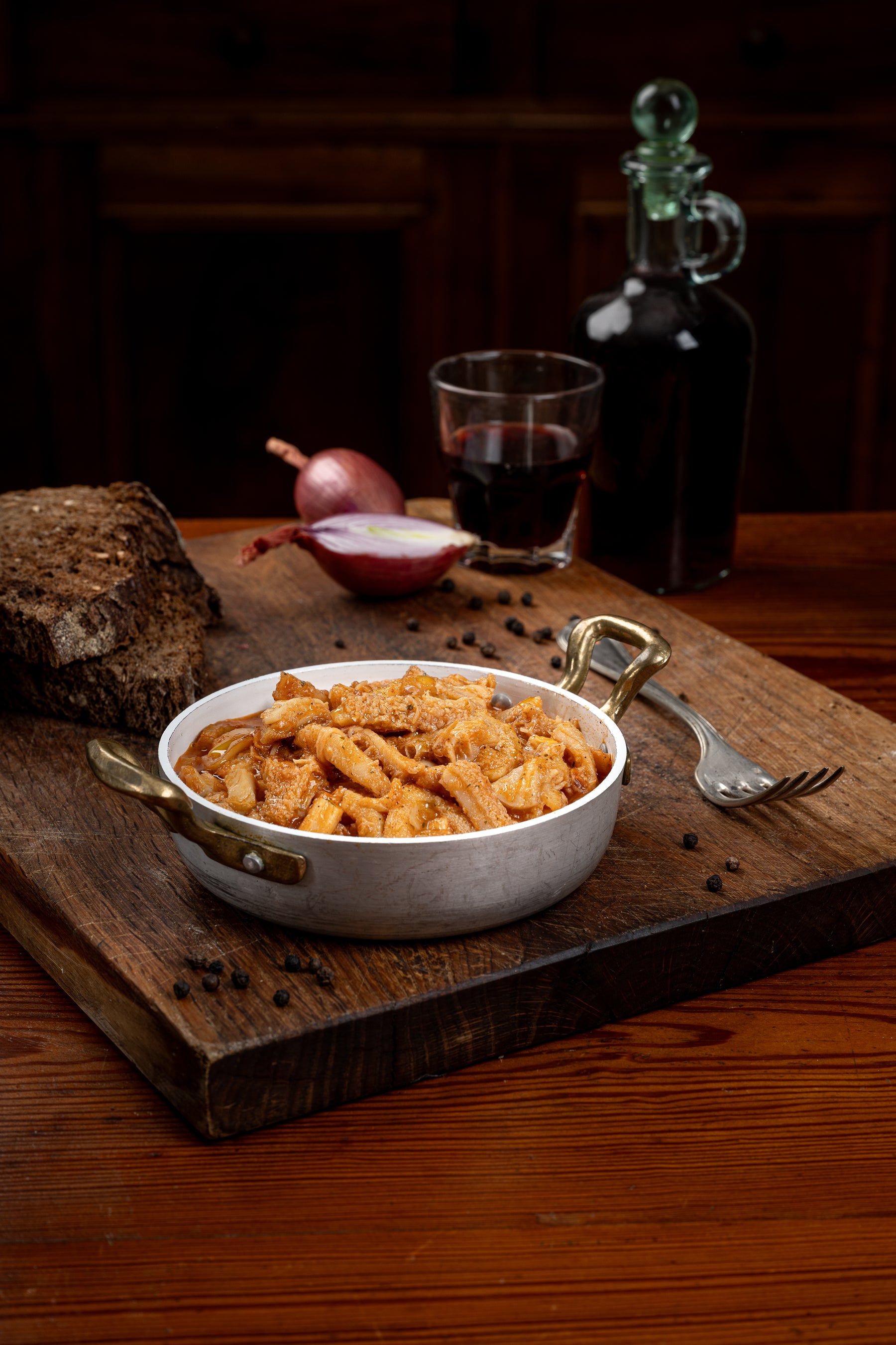 Trippa bovina 69%, cipolla, concentrato di pomodoro, olio extravergine di oliva, acqua, pomodoro, vino (contiene solfiti), sedano, carota, aglio, prezzemolo, sale, pepe.